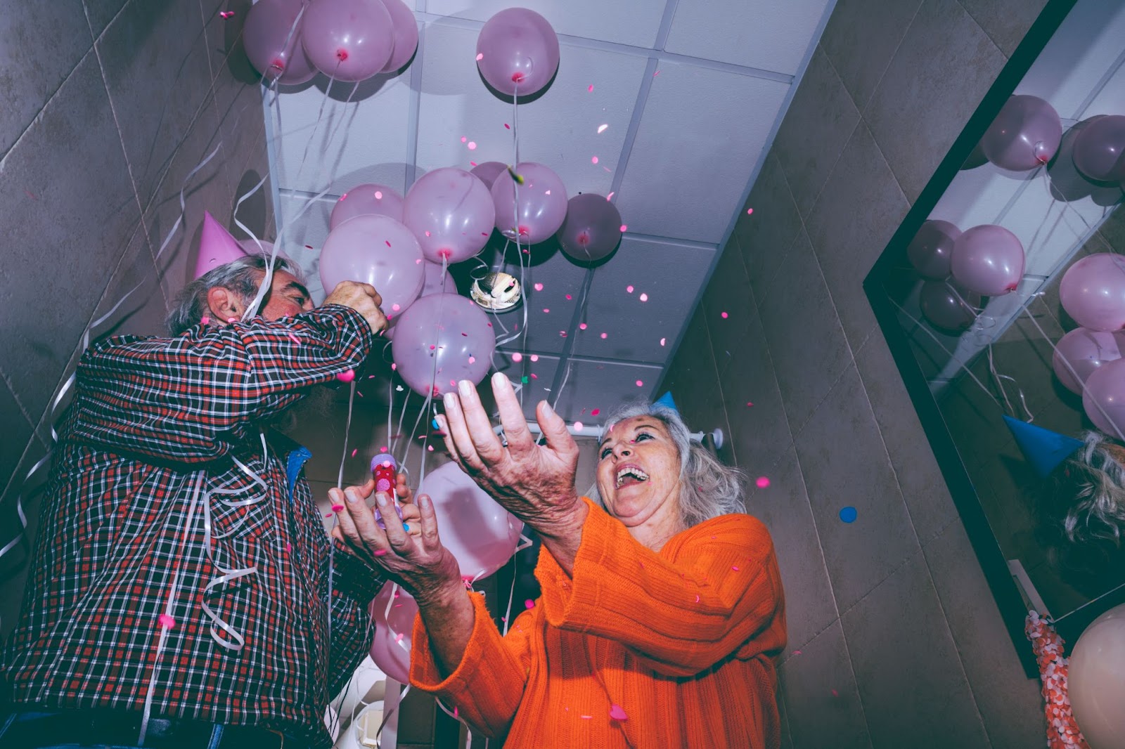 Pass out bags of confetti or silly string and toss around small balloons during a fun confetti throwing party game. To play the game, seat residents in two rows of chairs facing one another. Countdown from 10 and have residents toss as much confetti and as many balloons to the other side for about a minute. Encourage residents to throw back any confetti or balloons that land on them or on their side. The object of the game is to have the least amount of confetti on your side when time is up.