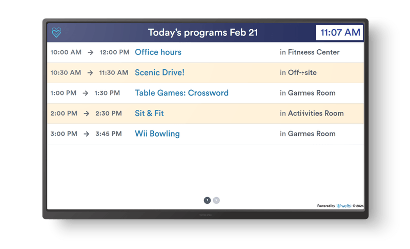 Welbi’s digital signage integration connects your existing systems – including PowerPoint, Yodeck, Optisigns, Bizplay, and Rise Vision – to a live stream of up-to-date programming, special events, and resident milestones. This works with the technology solutions already in place to ensure consistent corporate branding and enhance engagement by delivering accurate, visually compelling content to residents and families.