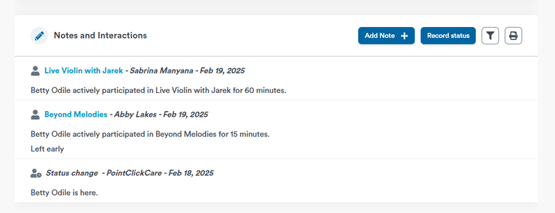Welbi automatically syncs resident admissions, transfers, and discharges from PointClickCare and MatrixCare every night, pulling in basic demographic data and detailed assessments. This unified profile not only tracks engagement data – such as activity attendance, progress notes, and personalized assessments.